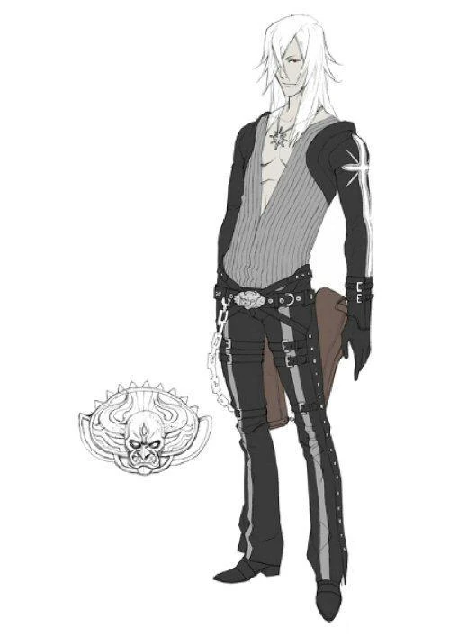 "Helter-Skelter" is the one hundred twenty-fourth trading card, and part of the Design Materials set. Only during a New Game +, it can be obtained by digging within Santa Destroy anytime after purchasing the Accelerator from Naomi's Lab. It is a design card depicting concept art for the eleventh ranked assassin Helter-Skelter, from early in the development of No More Heroes.
