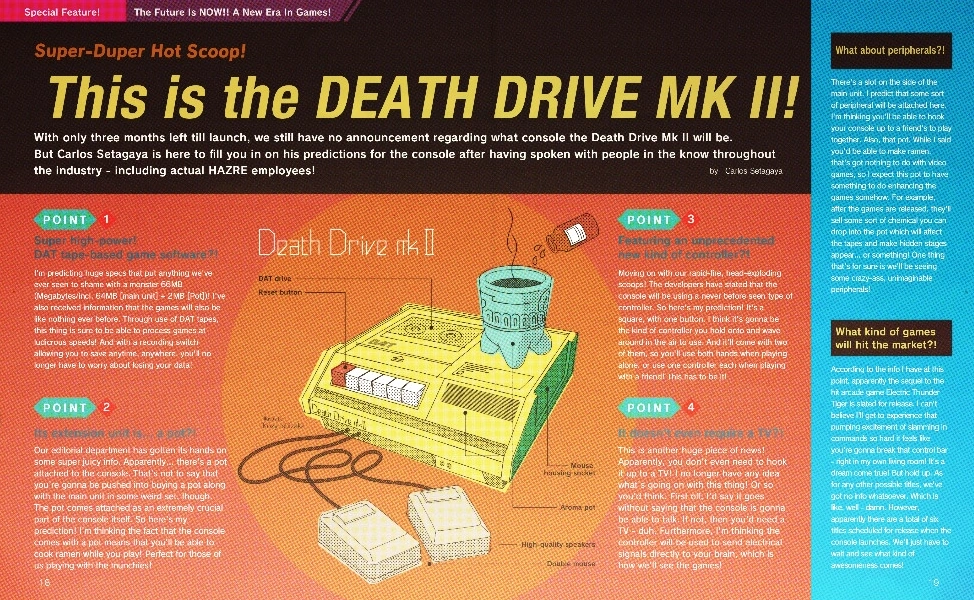 The Death Drive Mk II is known as the "Phantom Game Console" and it holds great power. As it is able to take people into the video game world. Also if someone is to collect all six games for the console to be granted one wish. These wishes are powerful enough to bring people back from the dead. When starting the game, a scream is heard.