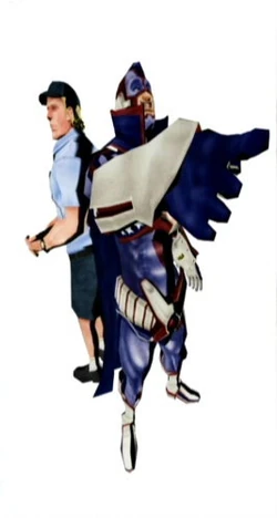 Destroyman is the one hundred thirty-ninth trading card, and part of the Design Materials set. Only during a New Game +, it can be obtained at Bear Hug Studio just prior to the seventh ranking match. It depicts the seventh ranked assassin, Destroyman.